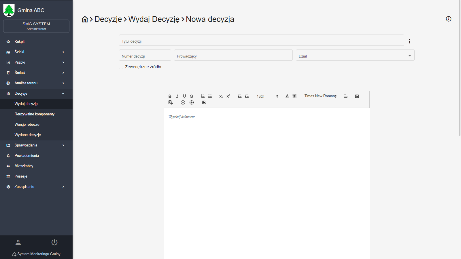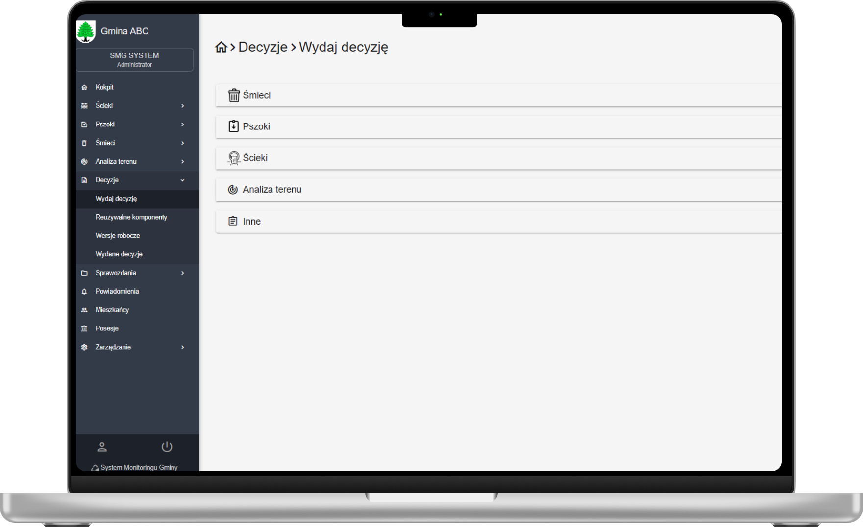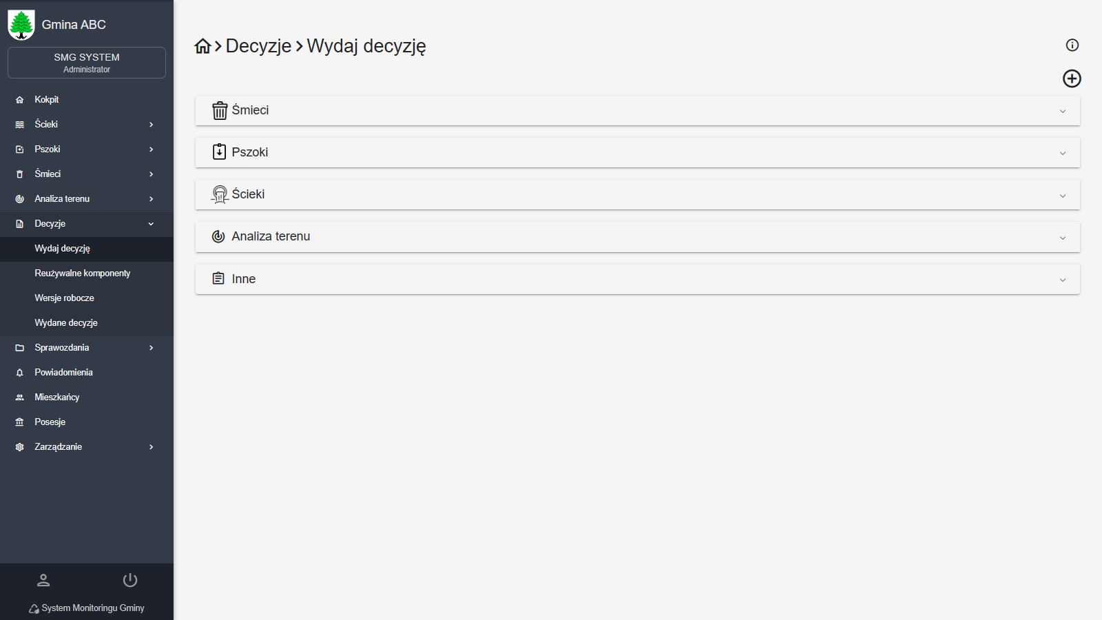 Moduł DECYZJE posiada funkcje, które pozwalają na umieszczenie w ramach jednolitego systemu SMG, oprócz najważniejszych segmentów gospodarki odpadowej, również orzeczeń administracyjnych, zarówno deklaratoryjnych, jak i konstytutywnych (tworzących prawa lub nakładających określone obowiązki dla mieszkańców gminy).